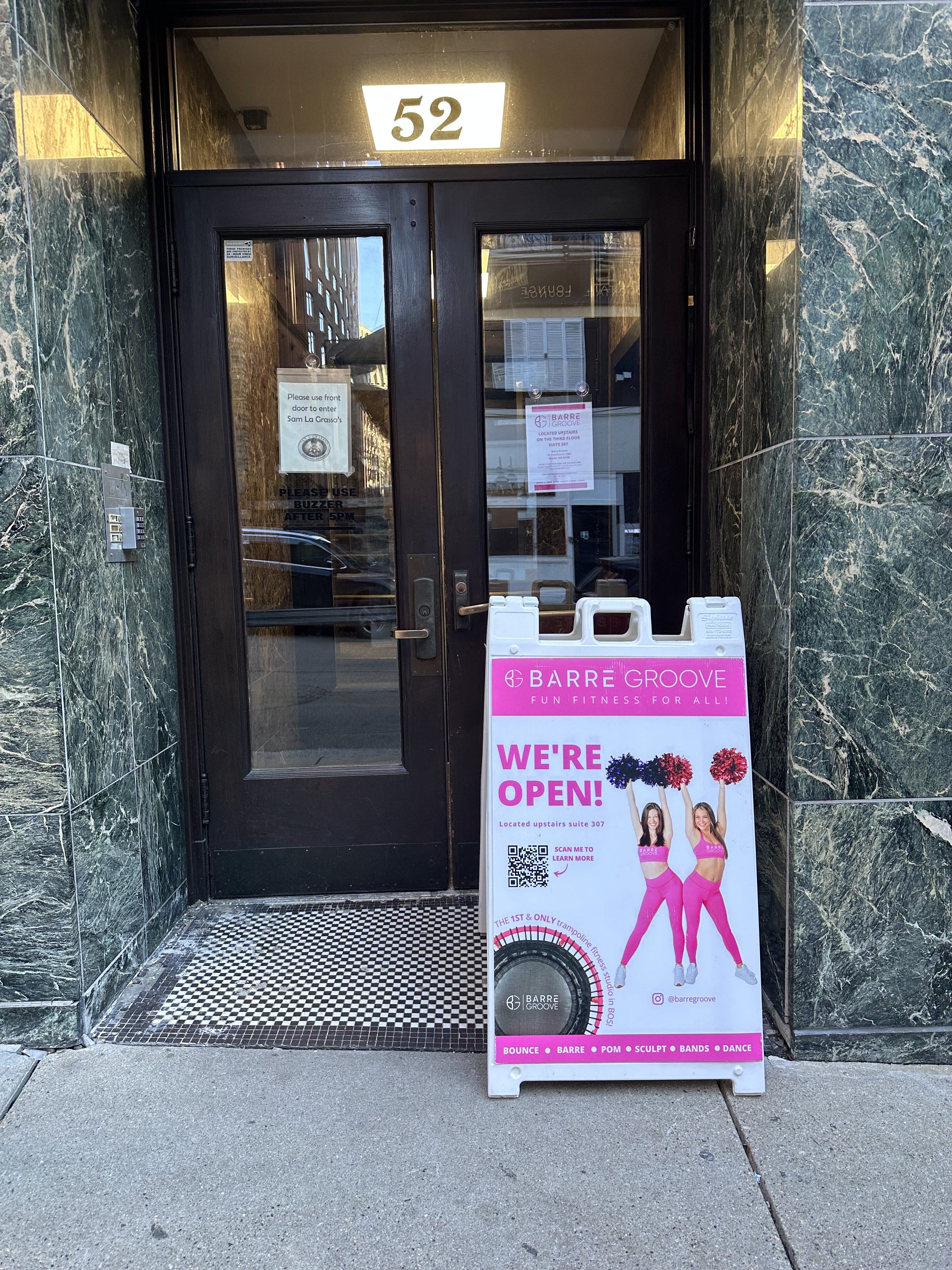 Look for Sam LaGrassa’s on Province Street. The entrance is the glass door between Sam LaGrassa’s and the eyebrow threading studio.